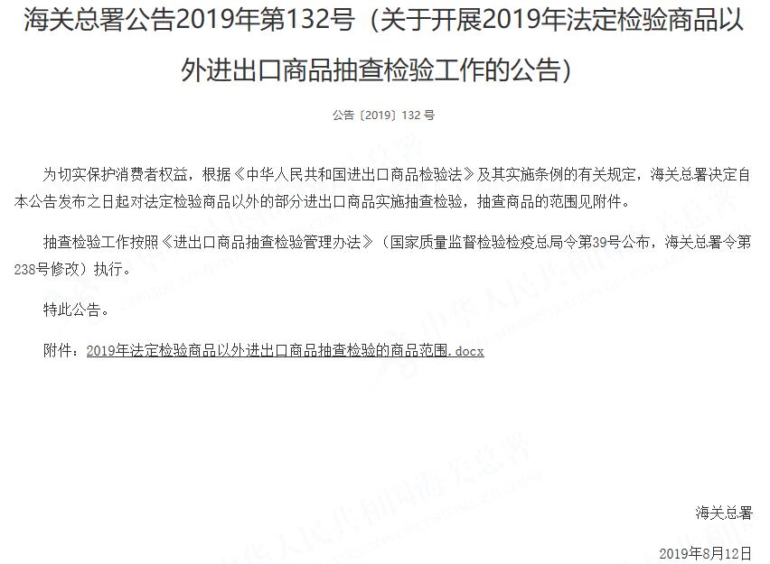海關(guān)總署公告2019年第132號(關(guān)于開展2019年法定檢驗商品以外進(jìn)出口商品抽查檢驗工作的公告)