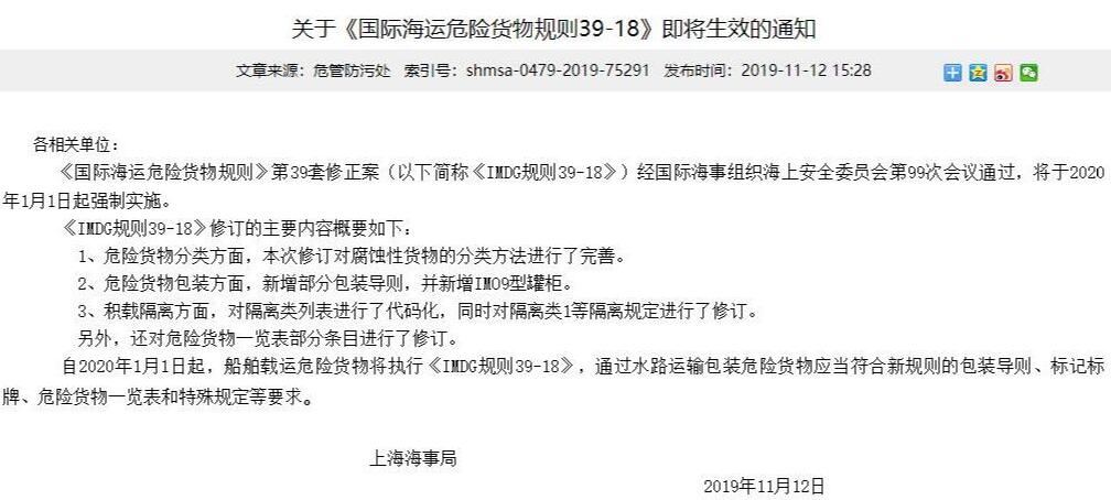 《國(guó)際海運(yùn)危險(xiǎn)貨物規(guī)則》第39套修正案(以下簡(jiǎn)稱《IMDG規(guī)則39-18》)經(jīng)國(guó)際海事組織海上安全委員會(huì)第99次會(huì)議通過(guò),將于2020年1月1日起強(qiáng)制實(shí)施。