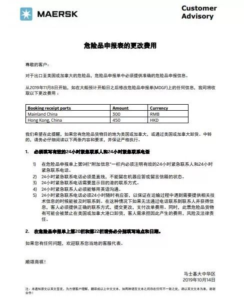 出口至美國(guó)或加拿大的危險(xiǎn)品,危險(xiǎn)品申報(bào)單中必須提供準(zhǔn)確的危險(xiǎn)品申報(bào)信息。從2019118日開始,如在大船預(yù)計(jì)開船日之后修改危險(xiǎn)品申報(bào)單(MDGF)上的任何信息,馬士基將收取更改費(fèi)。