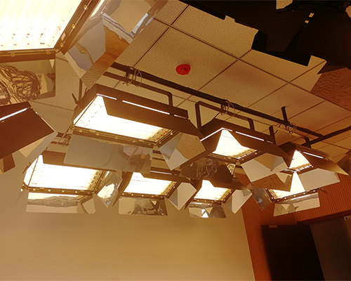 4、頂光:自舞臺上方投向舞臺的光,由前到后分為一排頂光、二排頂光等,主要用于舞臺普遍照明,增強舞臺照度,并且有很多景物、道具的定點照射,主要靠頂光去解決。