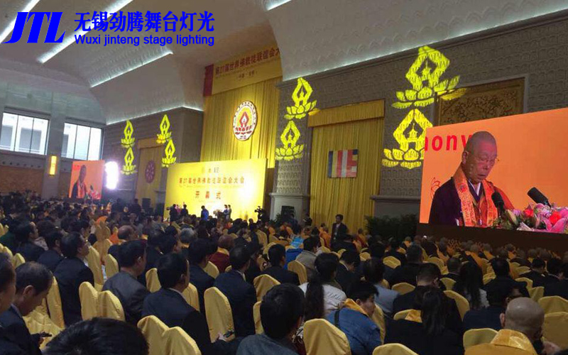 第27屆世界佛教徒聯(lián)誼會(huì)在中國寶雞市舉行,這是“世佛聯(lián)”大會(huì)******在中國內(nèi)地舉辦。大會(huì)燈光主要以照明為主,搭配一些圖案燈、染色燈,營造佛學(xué)氛圍。